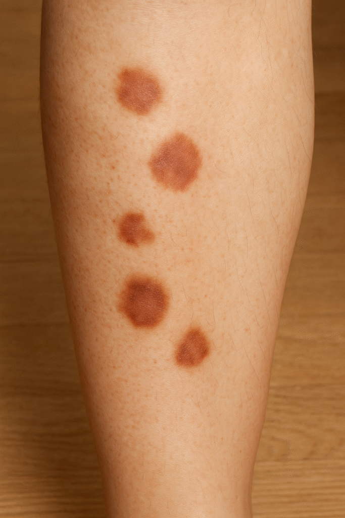 - Light brown, round or oval patches on the front of the leg 🦵are commonly linked with long-standing diabetes.