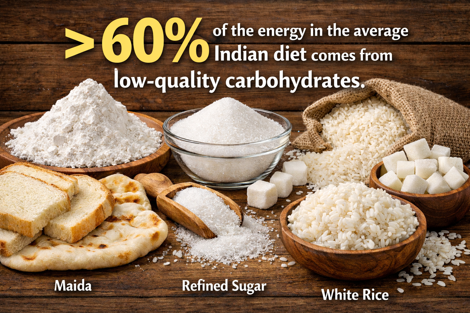 National data show that 62.3% of total energy intake in Indian diets comes from low-quality carbohydrates such as white rice, milled grains, and added sugars.